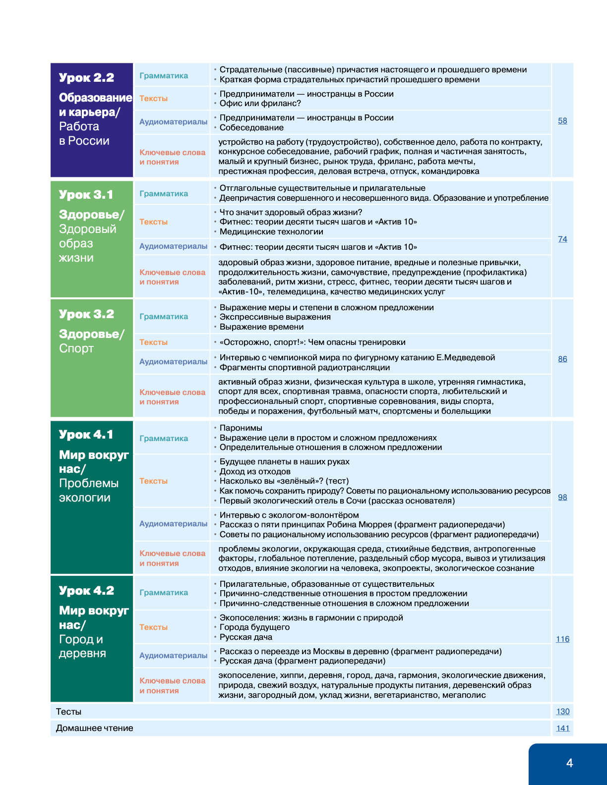 Das Buch umfasst 4 umfassende Lektionen , die jeweils in 2 fokussierte Einheiten unterteilt sind, und enthält 120 Minuten Audiomaterial zum Hörverstehen und Üben der Aussprache. Mit 80–100 Unterrichtsstunden Material unterstützt es den stetigen Fortschritt hin zum selbstständigen Sprachgebrauch.